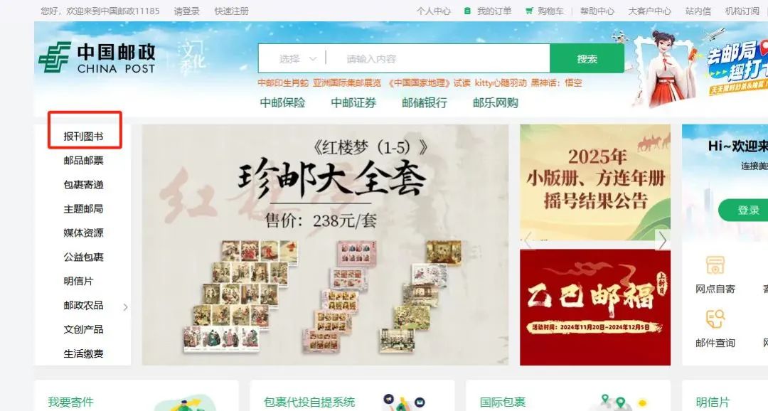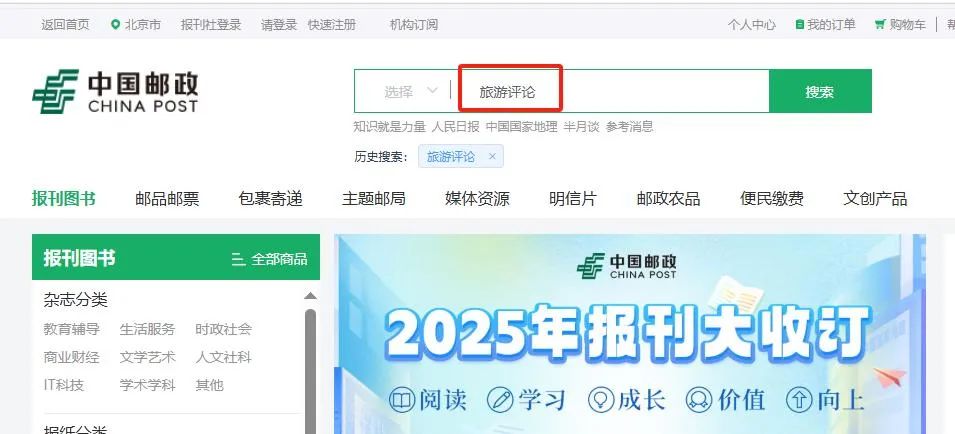 方式1:登錄中國郵政網上營業廳(PC電腦端:http://www.11185.cn),在“郵務業務”板塊中選擇“報刊圖書”,在搜索欄中輸入“旅游評論”。
