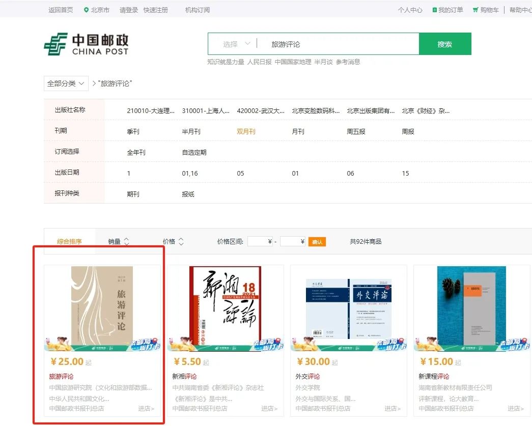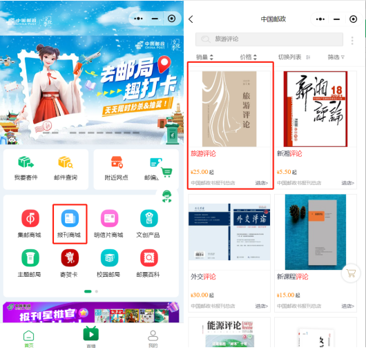 方式2:登錄微信“中國郵政商城”官方小程序,選擇“報刊商城”板塊,搜索“旅游評論”。