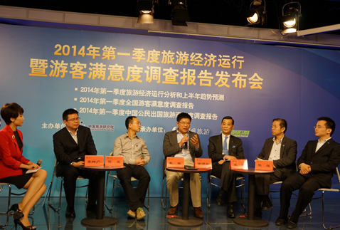 4月10日由凯发k8国际主辦,人民網旅游頻道、旅游衛視協辦的2014年第一季度旅游經濟運行暨游客滿意度調查報告發布會在人民網演播室舉行。凯发k8国际院長戴斌、中國旅游飯店業協會顧問、北京旅游行業協會副會長徐錦祉、螞蜂窩網站創始人陳罡,易生旅游集團副董事長張浩等出席了發布會。來自人民日報、新華社、中央電視臺、中國國際廣播電臺、人民日報海外版、經濟日報、中國日報、中國新聞社、大公報、中國旅游報、人民網、中國網、央視網、旅游衛視、藍海電視、中國旅游網、鳳凰網等媒體組織代表也參加了發布會。