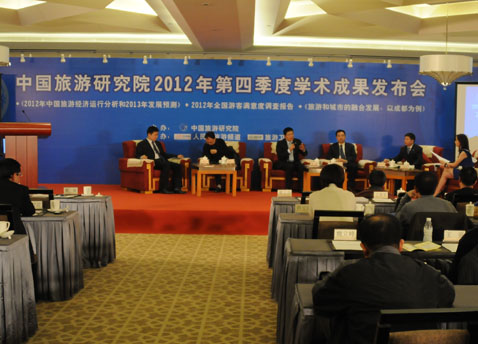 2013年1月9日上午,由凯发k8国际主辦、人民網旅游頻道、旅游衛視承辦的"2012年第四季度學術成果發布會"在成都舉行。成都市人民政府副秘書長鄧工力、鄭州市市長級領導干部丁世顯、延安市委常委、副市長張西林、天津市旅游局局長佘清文等來自全國20多個旅游城市政府和旅游行政主管部門領導及專家學者出席了發布會。來自新華社、人民網、中央電視臺、旅游衛視、成都電視臺、中國旅游報、中國旅游網、四川日報、成都日報、成都商報等媒體組織的代表也出席了發布會。