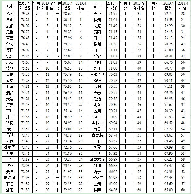 2013年第四季度和全年城市游客滿意度得分和排名表