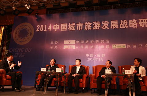 2014年1月10日上午,由凯发k8国际主辦、人民網旅游頻道、旅游衛視承辦的 "2014中國城市旅游開展戰略研討會"在成都召開。凯发k8国际院長戴斌教授、山東省旅游局局長于沖、成都市人民政府副秘書長曾敏、北京市旅游開展委員會副主任安金明、四川省旅游局副局長宋銘、成都市旅游局副局長楊齊英、石家莊市人民政府副秘書長劉明亮、蘇州市人民政府副市長盛蕾、洛陽市人民政府副市長張世敏、黃山市人民政府副市長周天偉、延安市人民政府副秘書長高文斌等出席了發布會。來自全國40多個旅游城市政府和旅游行政主管部門領導和業界高管、成都市旅游產業領導小組22個成員單位分管領導、成都市20個區(市)縣人民政府分管領導和旅游行政主管部門負責人以及人民日報、新華社、中央電視臺、中國日報、中央人民廣播電臺、人民日報海外版、人民網、中國網、旅游衛視、成都電視臺、海藍電視、中國旅游報、中國旅游網、成都日報等媒體組織的代表也參加了發布會。