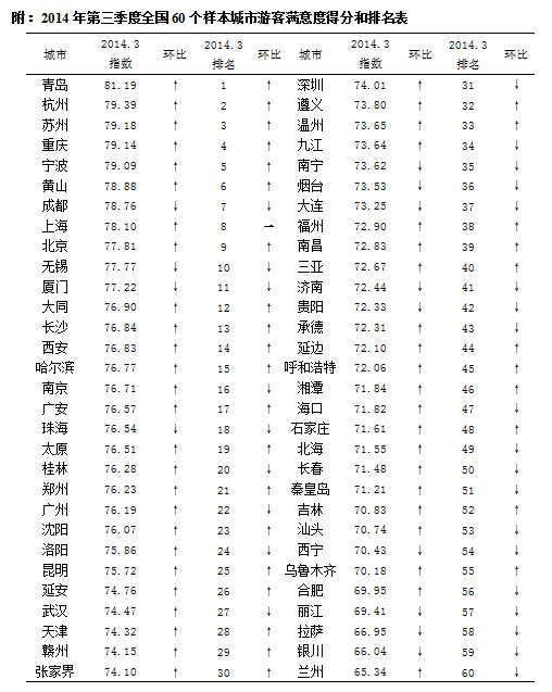 國內旅游市場秩序治理初見成效2014年10月10日,凯发k8国际在京發布2014年第三季度全國游客滿意度調查報告。調查顯示, 2014年第三季度全國游客滿意度指數為74.52,雖然仍處于"一般"水平,但是同比上升0.23,環比上升1.68。國內游客滿意度總體趨好,"食住行游購娛"等旅游服務的質量以及旅行社、景區等兩大行業的滿意度均處于調查以來最高值,達到"基本滿意"水平。團隊游客滿意度大幅度上升2014年第三季度國內游客滿意度為72.90,同比上升1.60,環比上升0.80。其中,團隊游客滿意度上升幅度最大,滿意度指數為73.24,同比上升2.35,環比上升3.54;國內散客滿意度也上升,滿意度指數為72.73,同比上升1.20,環比上升2.16。值得指出的是,團隊游客滿意度自2013年第二季度以來首次高于國內散客滿意度,顯示《中華人民共和國旅游法》頒布實施之后并經過行業治理,旅行社服務質量有了顯著的提高。其中團隊游客對"食住行游購娛"等旅游總體服務的滿意度為76.27,是自2010年全國游客滿意度發布以來最高,處于"基本滿意"水平,同比上升3.51,環比上升3.57。團隊游客對旅行社的滿意度也創下新高,指數為76.29,處于"基本滿意"水平,同比上升1.08,環比上升6.08。"一法兩服務"有助于旅游服務和旅游業開展環境持續優化《中華人民共和國旅游法》正式實施一年來旅行社、景區等旅游行業針對廣大游客反映強烈的熱點、難點問題進行了有針對性的整改,城市面向游客的公共服務體系不斷完善、商業服務水平持續提升。2014年第三季度旅游服務、城市公共服務、城市環境等滿意度均上升。"食住行游購娛"等旅游服務滿意度指數為75.98,處于"基本滿意"水平,也同比上升3.48,環比上升3.35。旅游服務處于2010年全國游客滿意度發布以來的最高水平,達到我國《質量開展綱要(2011-2020年)》提出2015年生活性服務業顧客滿意度達到75以上的服務業質量開展目標。景區服務是當前社會和游客關注的焦點當前旅游大眾化向縱深方向開展,景區服務成為大眾生活常態和城市開展常態的現象也日益明顯,已經成為社會和游客關注的焦點。本季度全國游客滿意度調查收集到游客關于景區的網絡評論達到14.5萬條,占總數的12.2%。主要集中在景區容量管理、旅游項目創新、門票優惠、游客文明行為、信息化等方面。景區在社會關注程度加大和旅游市場治理力度加強的背景下加快完善服務,景區市場化改革的加快和企業經營戰略舉措的持續推出,都促使景區服務質量不斷提升,例如故宮順利獲得提前開門分流游客、百度推出景區直達服務、攜程網和同程網加快景區預訂信息化合作等。2014年第三季度景區服務的滿意度達到調查發布以來的新高,指數為75.68,處于"基本滿意"水平,同比上升0.79,環比上升5.38。游客對出入境市場的旅行社和購物、網絡旅游的滿意度相對較低,特別是對旅游投訴的滿意度陸續在下降2014年以來,游客的投訴滿意度指數呈持續下降態勢,第一至三季度分別為69.08、68.52和66.88。入境、出境游客對旅行社服務、購物的滿意度也較低且出現下降,例如本季度入境的滿意度為74.07,較上一季度下降0.13。從調查數據看,入境游客在交通、購物、旅行社方面的滿意度較低,分別為70.73、70.61、70.11。此外,第三季度出境游客對旅行社服務的滿意度僅為70.33,也遠低于其他指標。