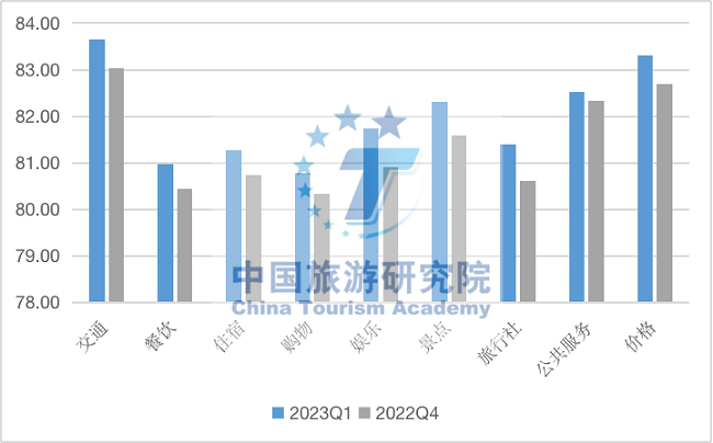 全國游客滿意度穩定在“滿意”區間且實現環比增長。2023年一季度全國游客綜合滿意度指數80.41,季度環比增長0.29%,低于2022年一季度同期水平(81.52)。2022年,疫情防控形勢下全國游客滿意度出現2016年以來的首次下降,進入2023年,全國旅游市場回歸安全、有序軌道,居民出游意愿和消費信心逐步恢復,游客取得感和幸福感增加,游客滿意度整體呈現企穩回升態勢。