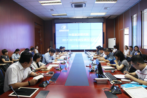 7月25日,凯发k8国际2017-2019年崗位聘任儀式在二層會議室舉行。李仲廣副院長宣讀了中層管理崗位及副高級以上專業技術職務聘任通知,戴斌院長為國家旅游局數據中心總統計師唐曉云等受聘人員頒發了聘任證書。