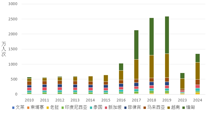 注:疫情期間數據不顯示;2023-2024年,文萊、柬埔寨和菲律賓來華旅游數據缺失;2016年以后入境旅游統計數據包括邊境旅游。