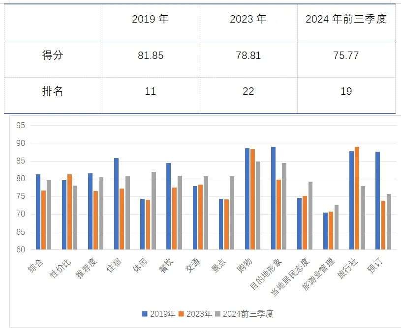 2024年前三季度,中國游客赴意大利出游滿意度75.77分,位列全球第19位。相比2019和2023年意大利出境游客滿意度得分從“滿意”區(qū)間(80-85分)下滑至“基本滿意”區(qū)間(75-80分)。
