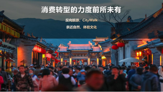 一是消費轉型的力度前所未有。隨著人們對美好生活向往的不斷提升,文體旅游服務的消費場景不斷創新。人們對于旅游業已經不再滿足于傳統的程式化、扁平化的“到此一游”,而是傾向于順利獲得生活化、沉浸式的方式走進城市、漫步鄉間,這是最近的一種新趨勢。而年輕人則更熱衷于反向旅游,CityWalk反映出他們對親近自然、體驗文化的向往和追求。