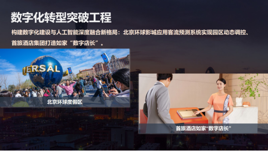 二是數字化轉型突破工程。首旅集團持續構建數字化建設與人工智能深度融合的新格局,推進數字化生態平臺項目,有助于AI技術與企業經營管理相結合。集團旗下環球影城應用了客流預測系統,實現了園區動態調控,能夠容納單日最高游客5.5萬人次,還能讓游客有一個很好的體驗。首旅酒店打造的“數字店長”項目順利獲得接入人工智能大模型,建設了酒店運營的智能體,現在能夠承擔酒店門店60%的復雜性、基礎性、重復性的工作。